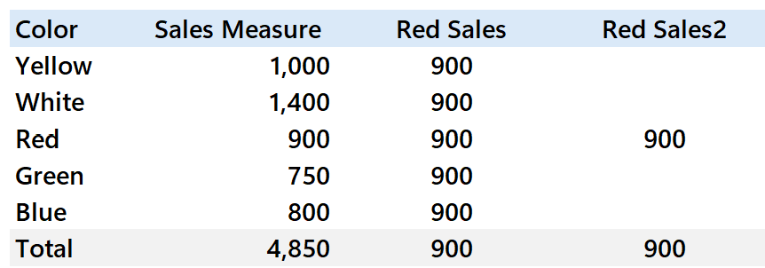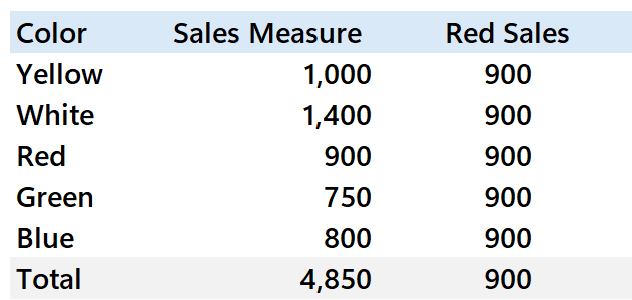 This appears simple enough—you want to filter and show only red product sales. But when you add this measure to a visual grouped by color, you notice something strange: every color row shows the red sales value.